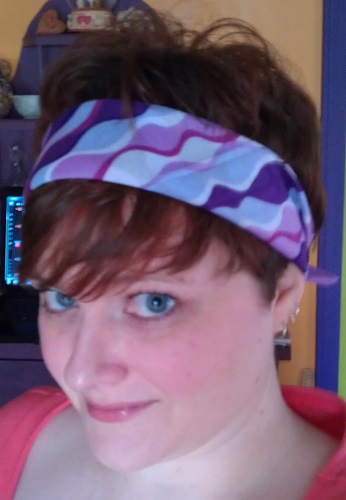 Today (as in the day I’m writing this blog post, not necessarily the day I’m posting it) I was feeling a ’60s vibe. So I wore a coral shift dress, white flats, and tied a wavy-patterned, purple bandana around my head in a ’60s style, fluffing up my my hair at the crown of my head to really sell it. I even did my make-up in a more ’60s style, but not too overtly ’60s. I don’t have the skill with false eyelashes and eyeliner to do that.