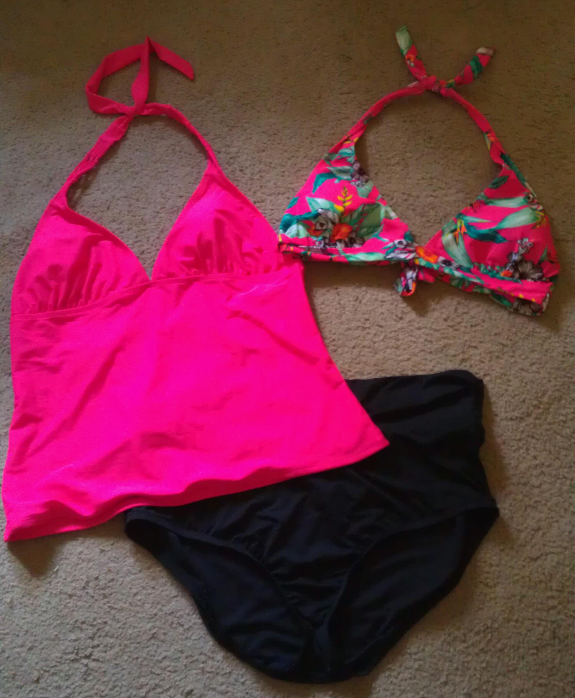 In the end, I got what you see in the picture. A pair of bottoms, a tankini, and a halter style top. I was pretty excited about getting them, more excited that they fit, and positively thrilled at the fact that I think I look pretty damn spiffy in both top styles. Yes, even the one with my fat belly exposed.