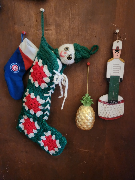 Over the years, I had a few different stockings, but my favorite was, of course, one that my grandma made. My sister got one, too. For years everything we had was matchy-matchy, but in different colors. Both of our stockings were crocheted with little stuffed snowmen that fit in the top. Mine is green; my sister’s is red.