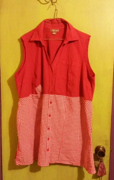 The other piece I ended up doing is a handkerchief style tank. I sewed together to different ribbed tanks to get the color block effect. I then split the lower tank up the side and added in the plaid panels. Turns out that was the hardest part, trying to get the angles just right. That and all of the sewing because of the angles and the hems I needed to create.